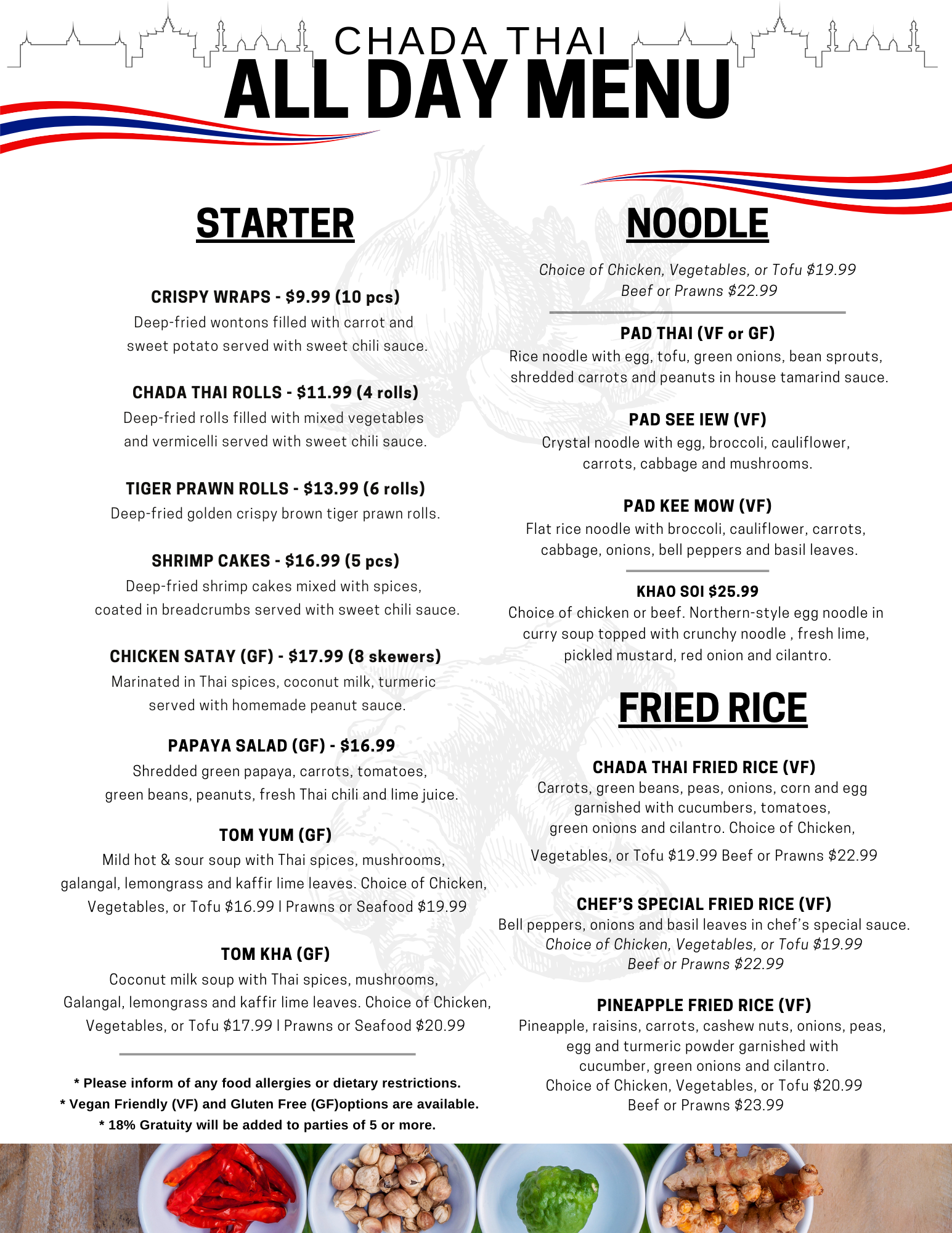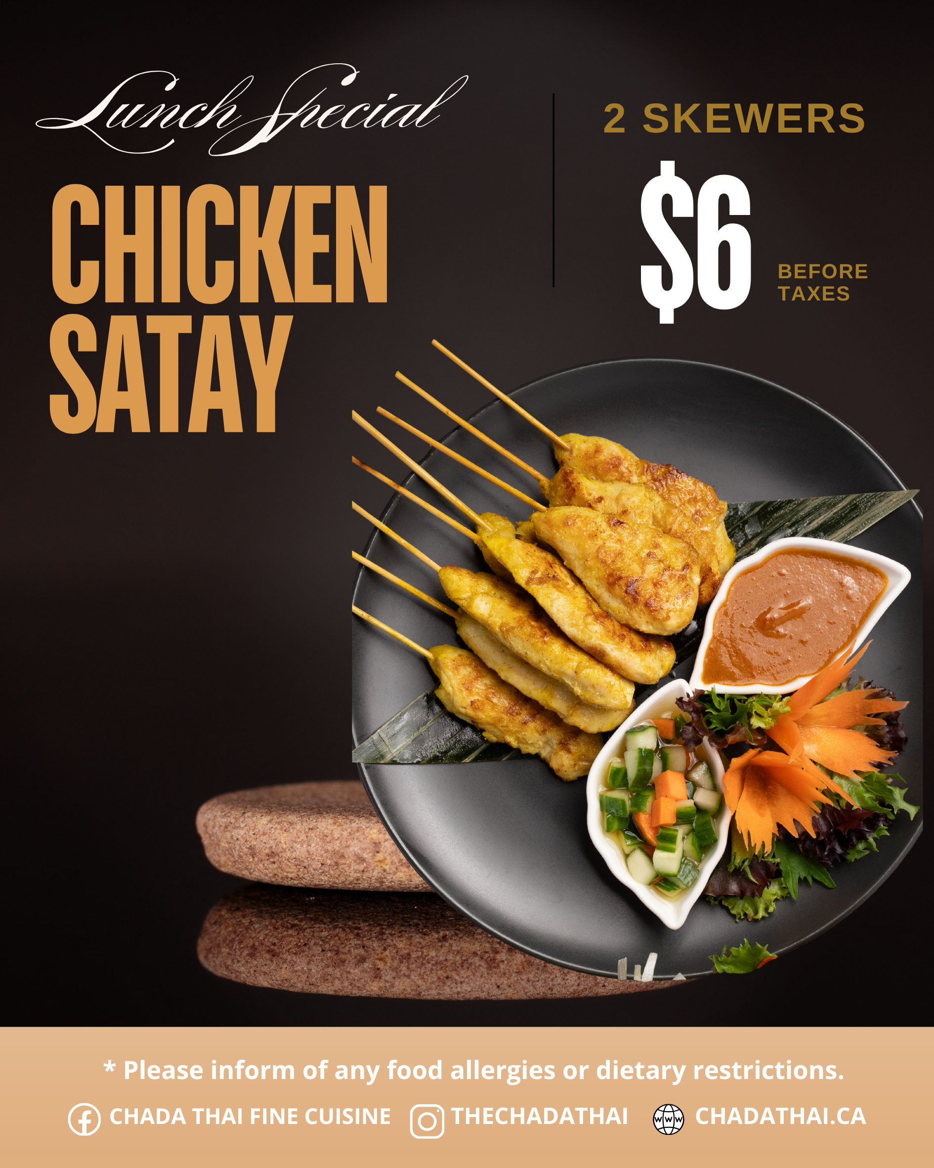 NEW LUNCH SPECIAL ALERT! Starting October 1st, swing by Chada Thai for a delicious deal you won’t want to miss. 2 Chicken Skewers for just $6 (before tax)! Perfectly grilled, tender, and full of flavour — it’s the quick & tasty lunch your day needs. Available for a limited time during lunch hours (11:30 - 2:30).