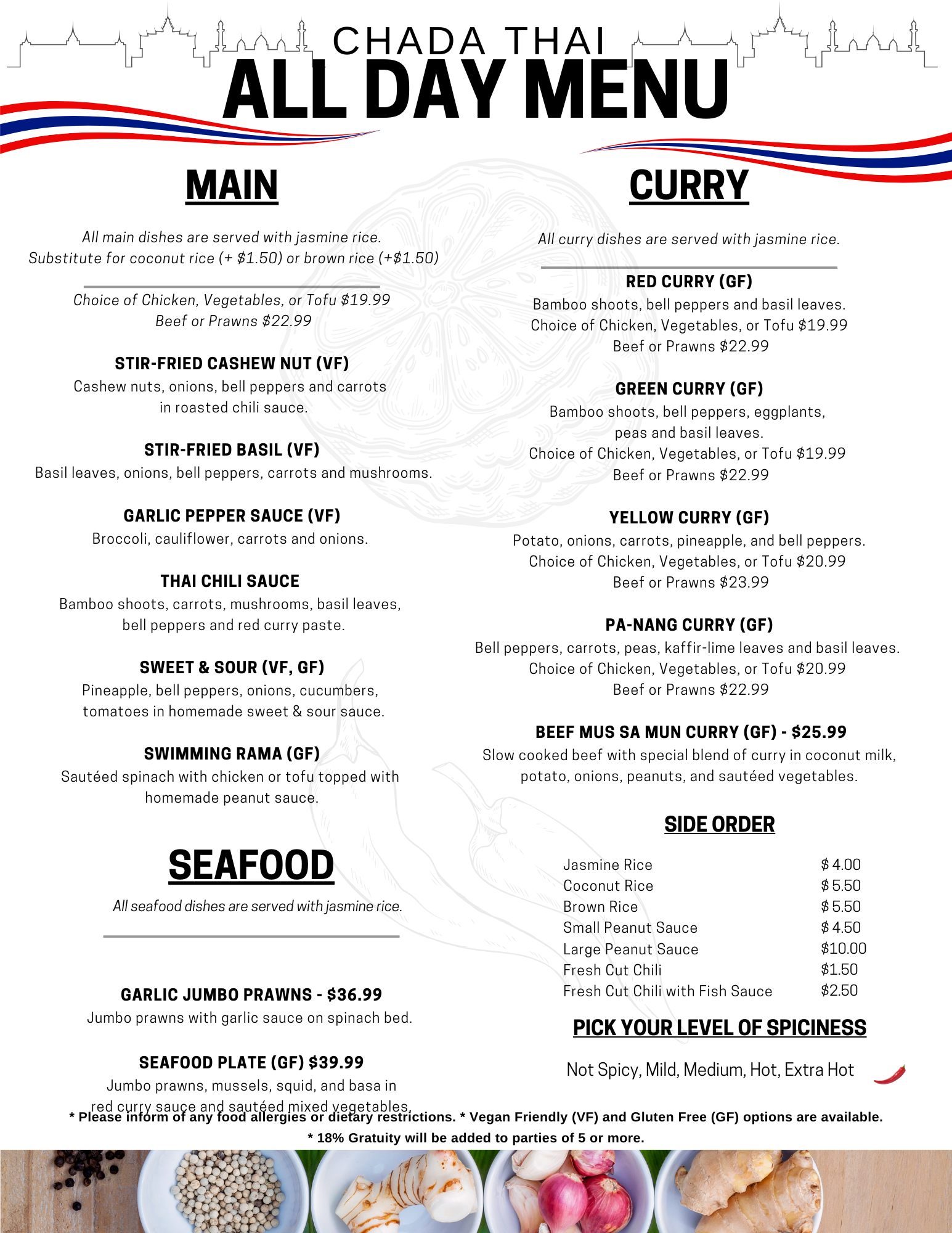 All main dishes are served with jasmine rice. Substitutes with coconut rice (+ $1.50) or brown rice (+$1.50) | Choice of Chicken, Vegetables, or Tofu $19.99 | Beef or Prawns $22.99
